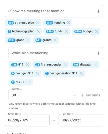 Only results where both categories of terms are mentioned within 60 seconds of each other will be returned.