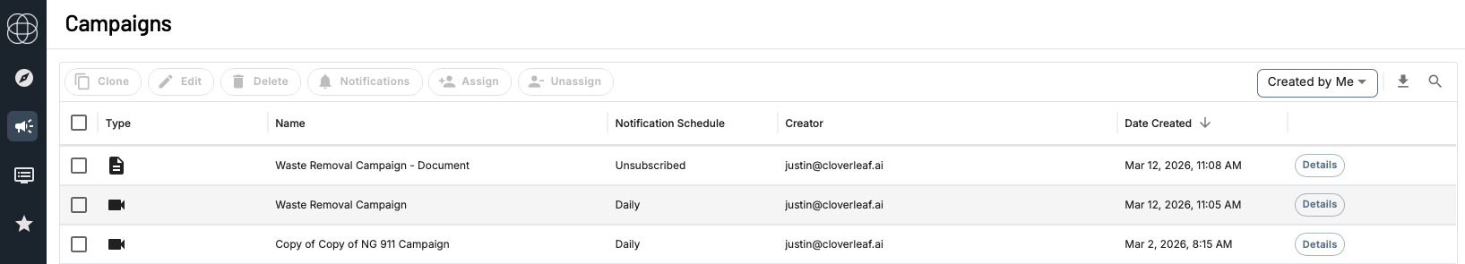 All territory updates are made from the Campaigns page. Click the microphone icon in the left navigation menu from anywhere in Cloverleaf to get there. You'll land on the All Campaigns tab, where you can see every Campaign you're subscribed to - including ones you created and any assigned to you by your organization's admins.