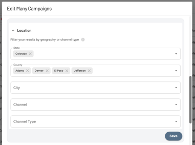 From here, you can update location filters on a single Campaign or across multiple Campaigns at once.