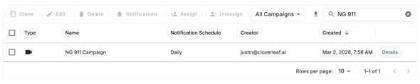 Navigate to the Campaigns page from the left hand side of any page. You will land on the All Campaigns tab to view all of the campaigns that you are subscribed to. This includes any campaigns that you have created or have been assigned to you by your organization's admins.