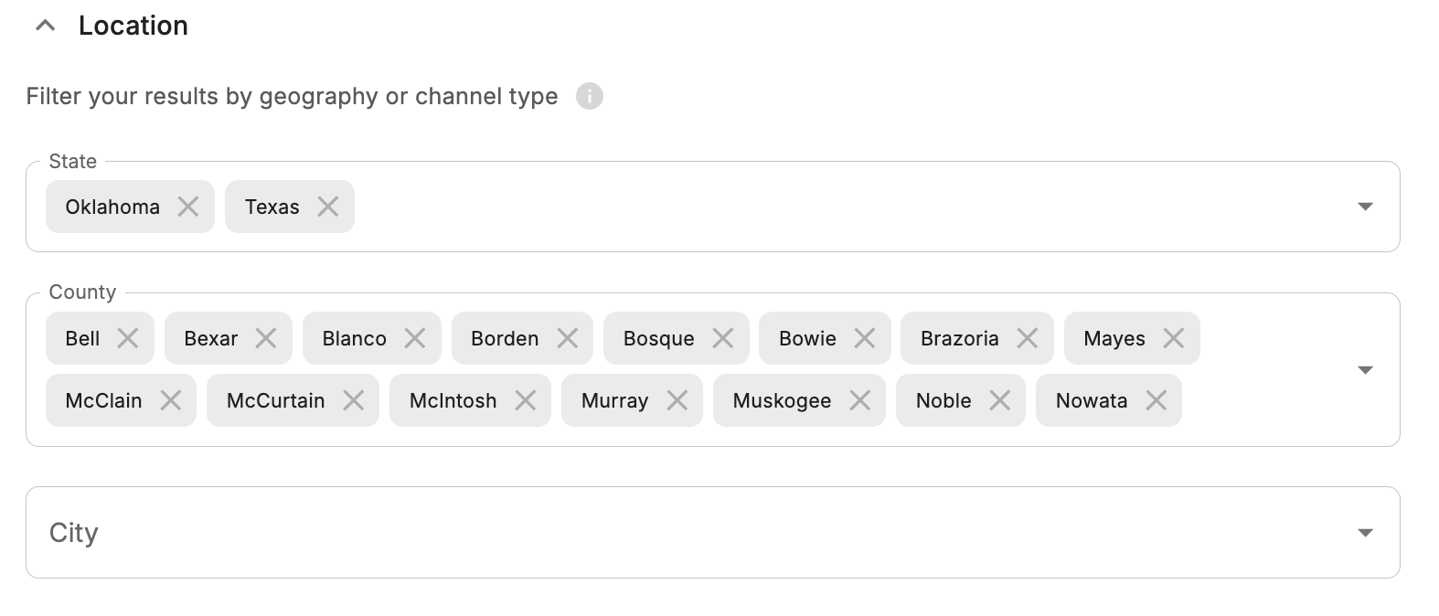 The campaign editor will open and you can update the location filters to change your territory. Location filters let you quickly narrow results by State, County, and City. The filters work hierarchically, meaning each level becomes more specific as you move down. The most specific location selected always controls the results.